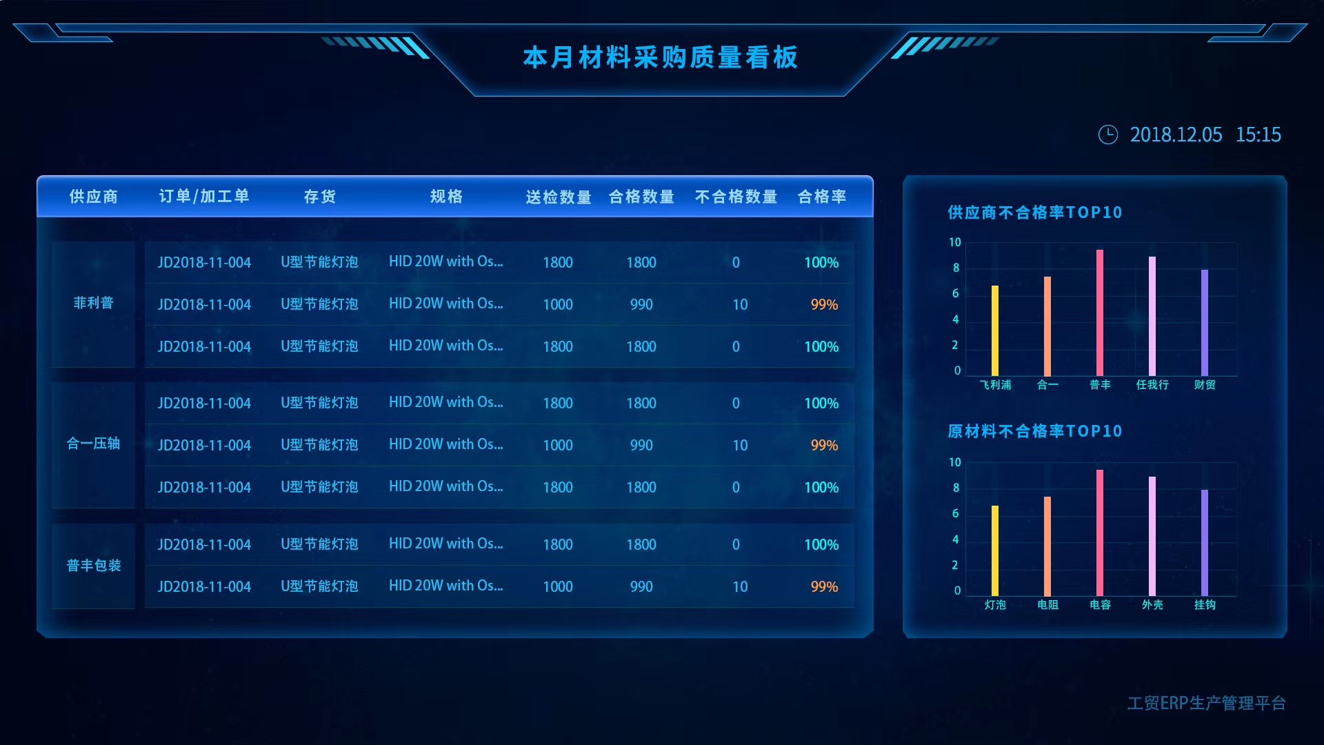 5、质量管理:通过看板直观了解产品实时质量信息并对不良品进行追踪与管控,及时做出改正措施以预防不良品的产生。